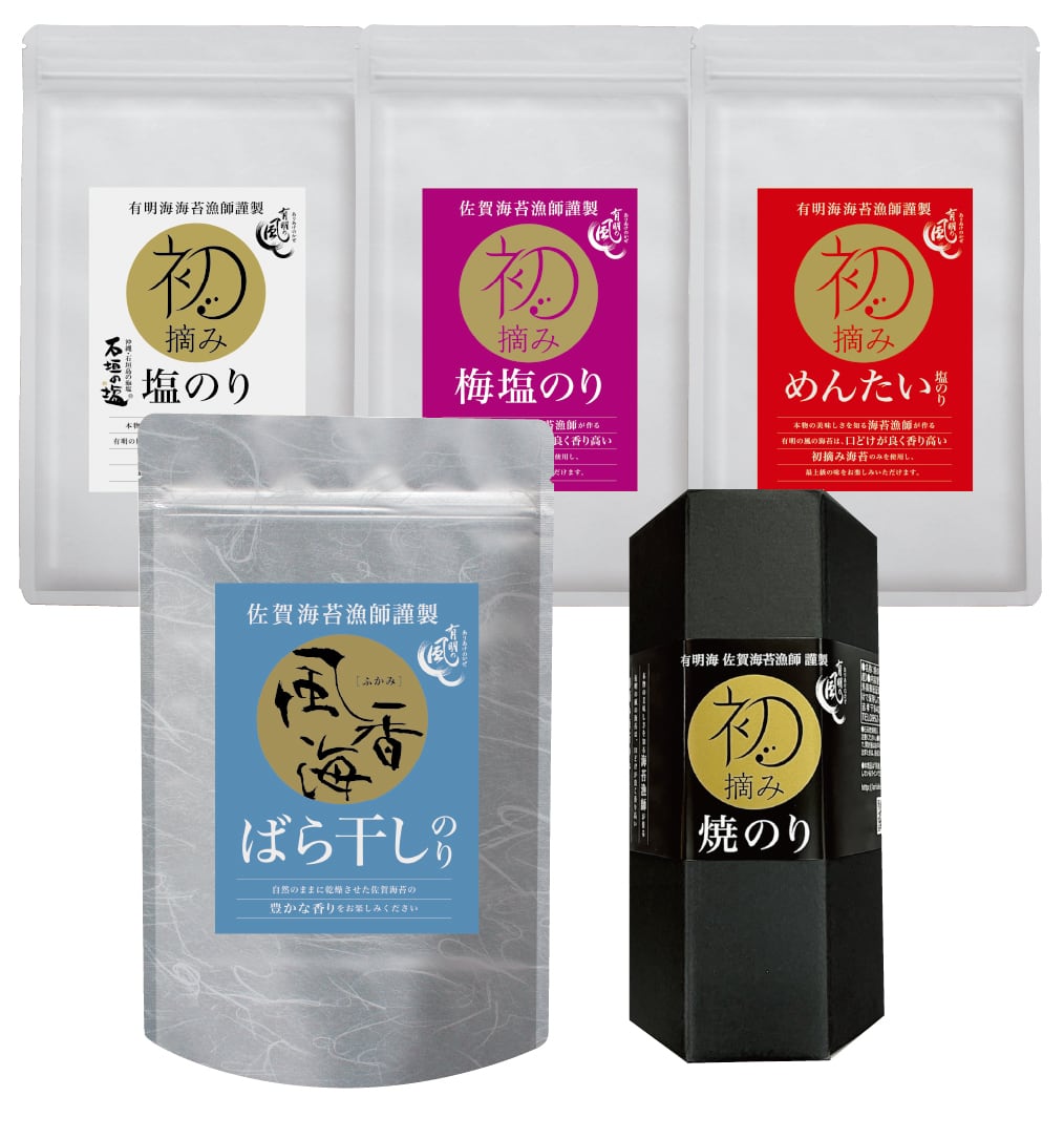焼のり(8切40枚入)、塩のり(8切20枚入)、梅塩のり、めんたい塩のり(8切20枚入)、風香海(ばら干しのり) 各1個